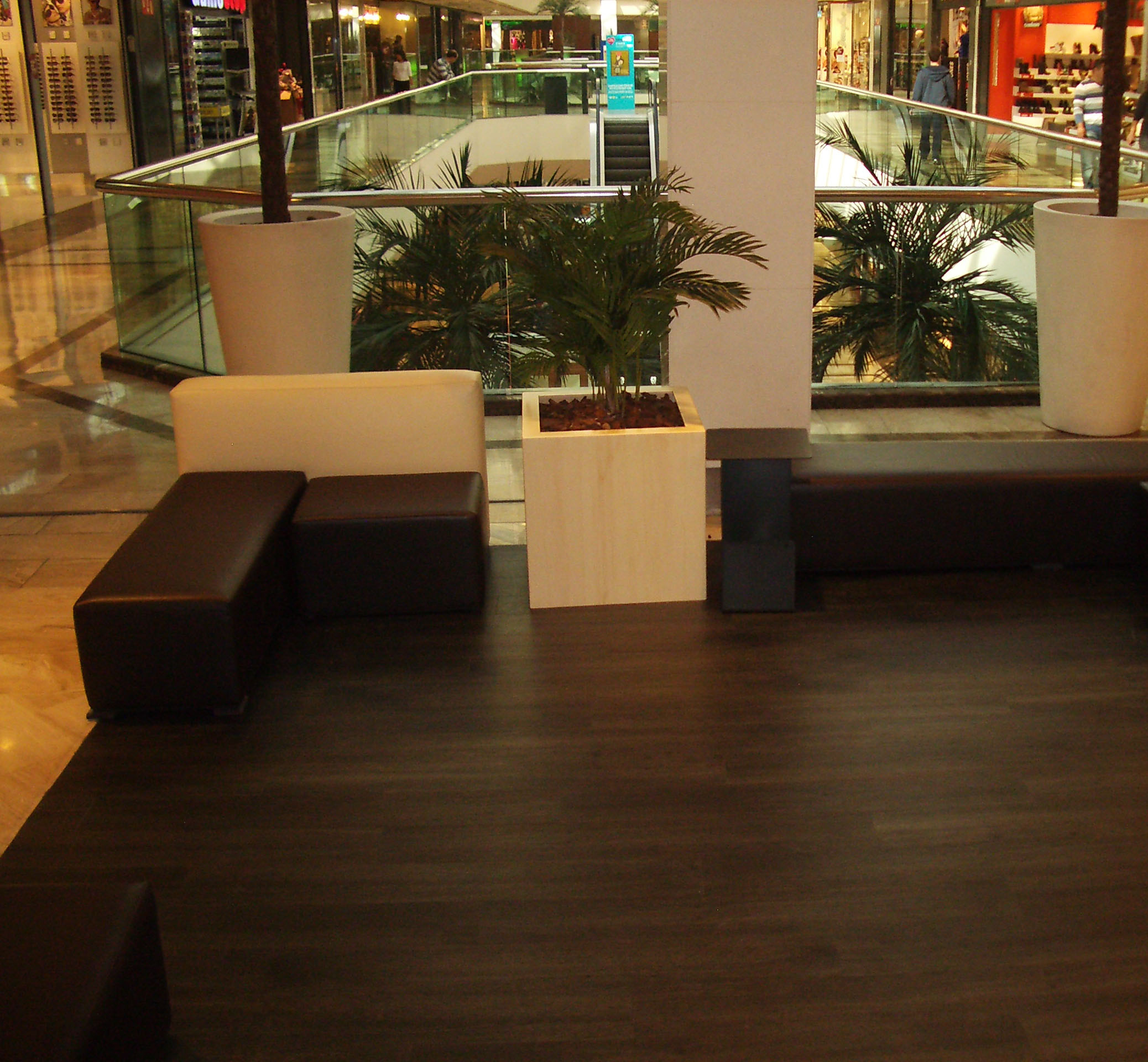 Para estas zonas se buscaba un material que tuviera gran resistencia y durabilidad debido al alto tráfico de gente que hay en el centro comercial; además querían para estas zonas un ambiente acogedor y es por ello que se decantaron por un decor en formato lama imitación madera lo que le aporto la calidez.