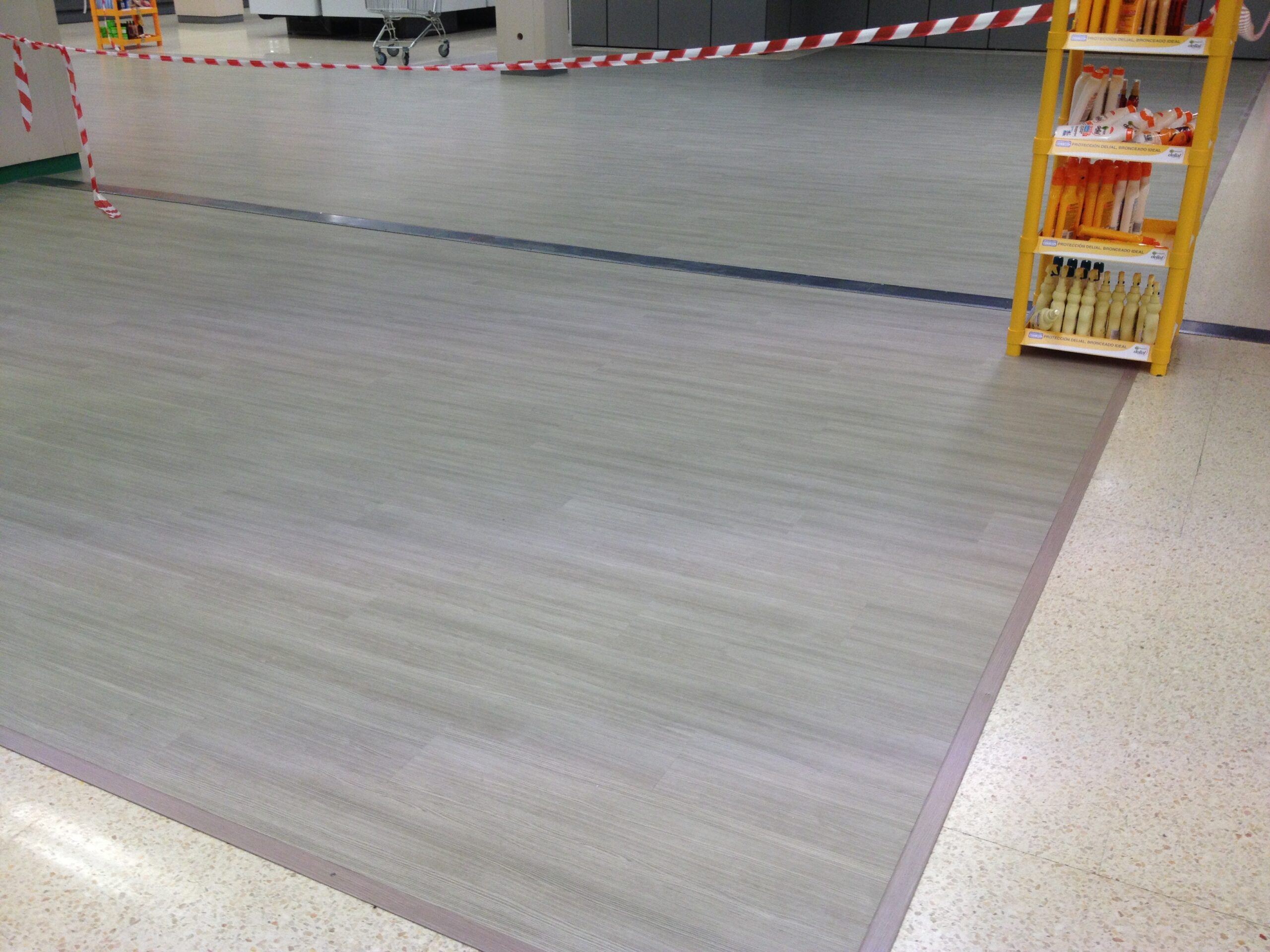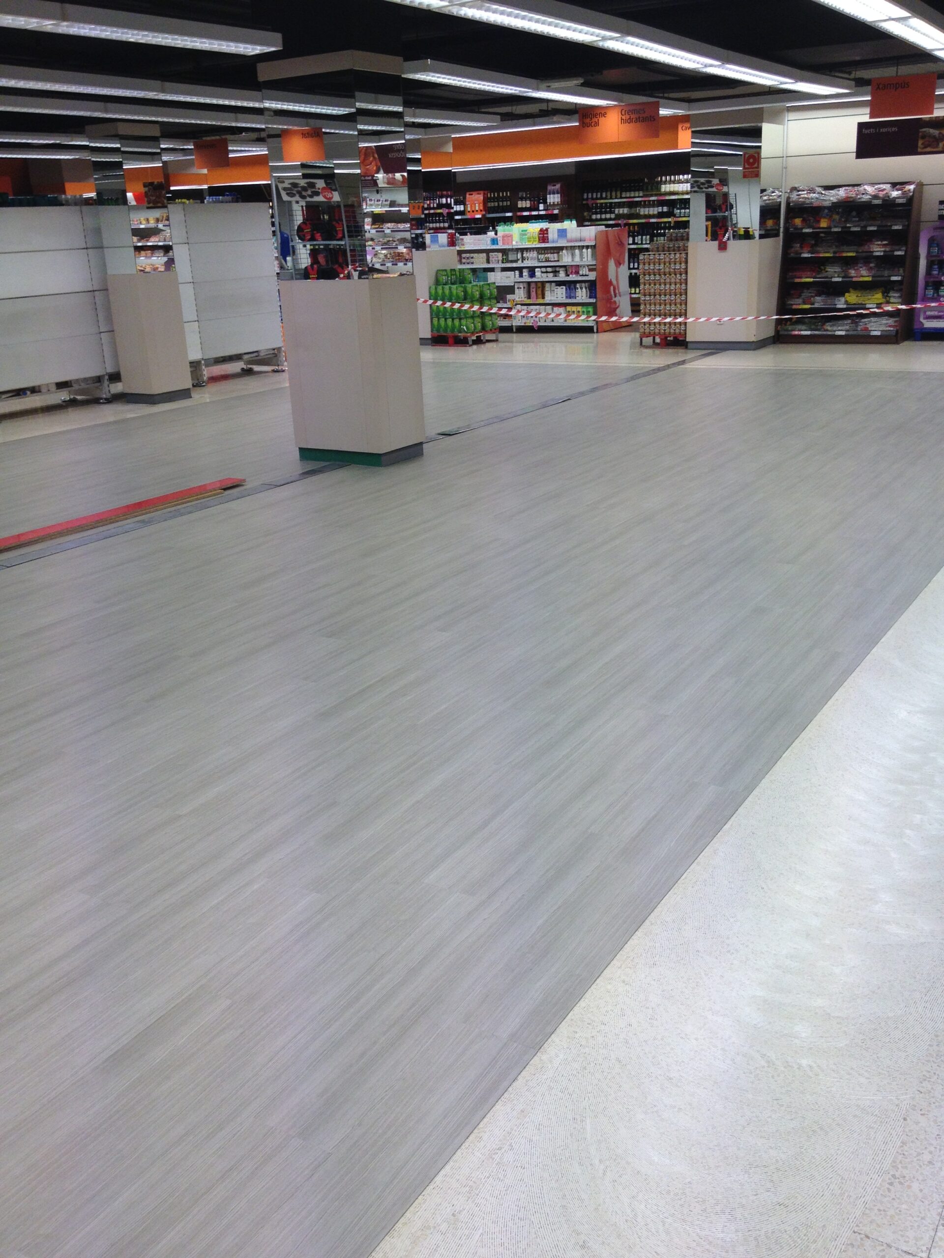 Instalación de 126 m2 de suelo de pvc Liberty Urban referencia línea beige 5609-14 en el supermercado Consum de la c/ Berruguete  de Barcelona, el pavimento se colocó en la zona de perfumería. Esta es la primera de varias instalaciones de Liberty Urban que se harán en varios centros Consum.