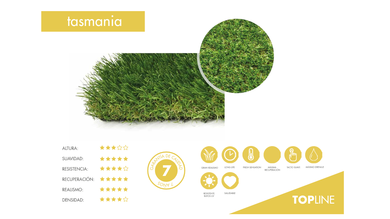 El nuevo modelo TASMANIA incluido en nuestra gama TOP LINE, cuenta con un hilo de última generación (desarrollado bajo la tecnología Dgreen Technology) “multidireccional”, multiforme y multicolor (cinco tipos de colores en total, tres en el hilo recto y dos en el texturizado) de 35 mm. Este tipo de hilo tiene una gran capacidad de recuperación a la pisada y excelente suavidad, soporta el tránsito intenso, tratamiento especial contra los rayos UV, tiene menos necesidad de cepillado que un hilo tradicional, no deja marca y tiene un aspecto muy natural para poder satisfacer las necesidades de cada proyecto decorativo y de paisajismo.