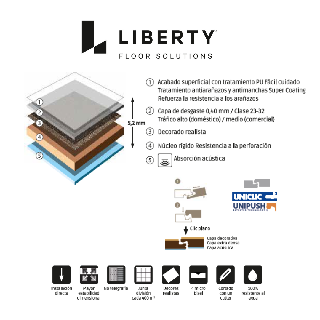 Dentro de la categoría de pavimentos vinílicos SPC, Liberty Floors destaca por su calidad y diseño. Ofrece una amplia gama de diseños modernos y elegantes en formato lama y loseta que imitan a la perfección la madera y otros materiales naturales, brindando un acabado estético superior. Son muy resistentes al desgaste, impactos y arañazos gracias a su capa superior tratada con PU que además facilita el mantenimiento, su núcleo rígido para darle mayor estabilidad dimensional y su backing o base incorporada que le proporciona mayor calidad acústica.